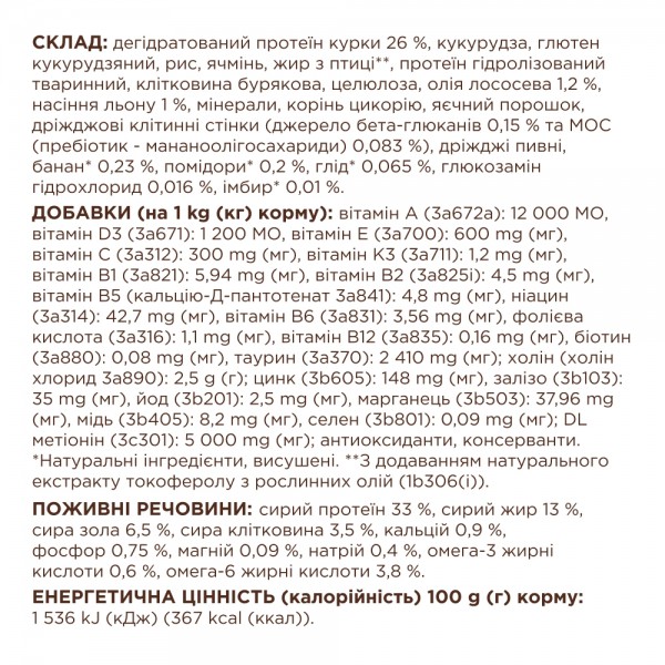 СКЛАД: дегідратований протеїн курки 26 %, кукурудза, глютен кукурудзяний, рис, ячмінь, жир з птиці**, протеїн гідролізований тваринний, клітковина бурякова, целюлоза, олія лососева 1,2 %, насіння льону 1 %, мінерали, корінь цикорію, яєчний порошок, дріжджові клітинні стінки (джерело бета-глюканів 0,15 % та MOС (пребіотик - мананоолігосахариди) 0,083 %), дріжджі пивні, банан* 0,23 %, помідори* 0,2 %, глід* 0,065 %, глюкозамін гідрохлорид 0,016 %, імбир* 0,01 %.