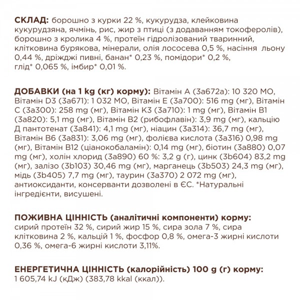 Склад: борошно з курки 22 %, кукурудза, клейковина кукурудзяна, ячмінь, рис, жир з птиці (з додаванням токоферолів), борошно з кролика 4 %, протеїн гідролізований тваринний, клітковина бурякова, мінерали, олія лососева 0,5 %, насіння льону 0,44 %, дріжджі пивні, банан* 0,23 %, помідори* 0,2 %, глід* 0,065 %, імбир* 0,01 %.