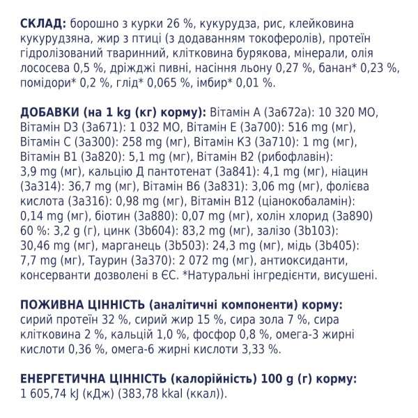 Склад: борошно з курки 26 %, кукурудза, рис, клейковина кукурудзяна, жир з птиці (з додаванням токоферолів), протеїн гідролізований тваринний, клітковина бурякова, мінерали, олія лососева 0,5 %, дріжджі пивні, насіння льону 0,27 %, банан* 0,23 %, помідори* 0,2 %, глід* 0,065 %, імбир* 0,01 %.