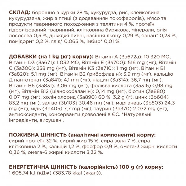 Склад: борошно з курки 28 %, кукурудза, рис, клейковина кукурудзяна, жир з птиці (з додаванням токоферолів), м‘ясо та продукти тваринного походження з телятини 4 %, протеїн гідролізований тваринний, клітковина бурякова, мінерали, олія лососева 0,5 %, дріжджі пивні, насіння льону 0,29 %, банан* 0,23 %, помідори* 0,2 %, глід* 0,065 %, імбир* 0,01 %.