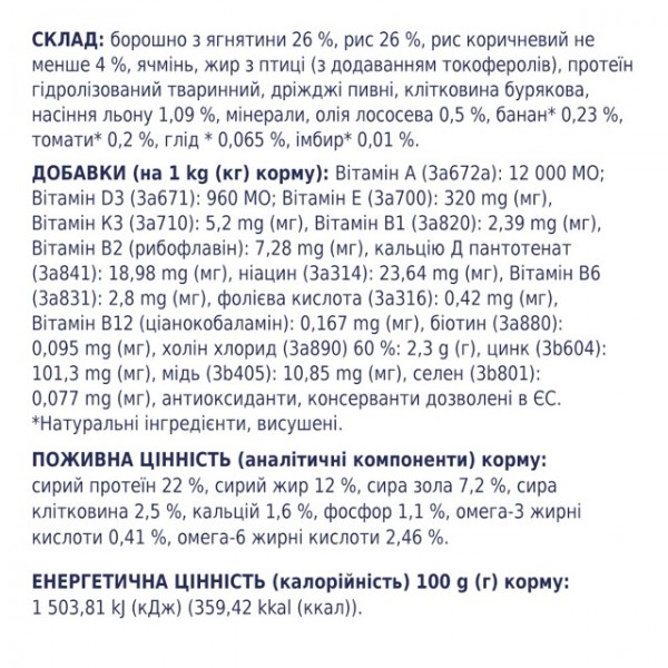 Склад: борошно з ягнятини 26 %, рис 26 %, рис коричневий не менше 4 %, ячмінь, жир з птиці (з додаванням токоферолів), протеїн гідролізований тваринний, дріжджі пивні, клітковина бурякова, насіння льону 1,09 %, мінерали, олія лососева 0,5 %, банан* 0,23 %, томати* 0,2 %, глід * 0,065 %, імбир* 0,01 %.