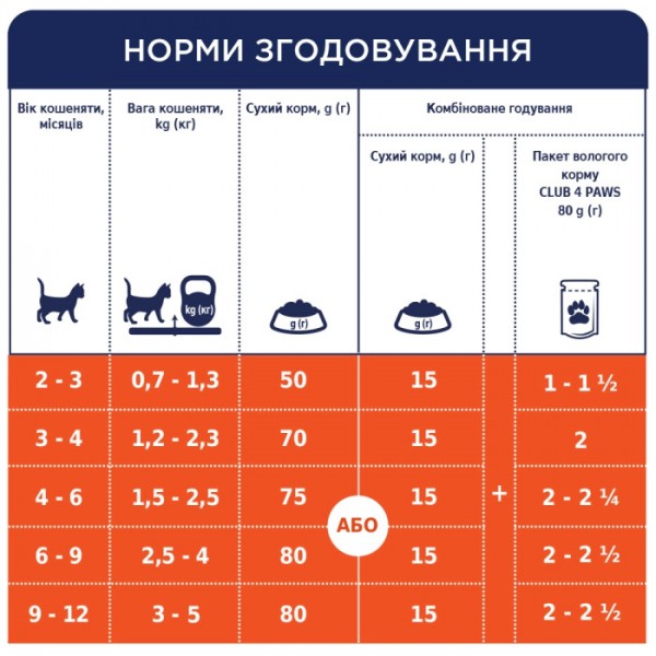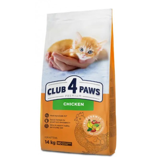 B4631001 " />Сухий преміум-раціон Club 4 Paws для кошенят містить м'ясні інгредієнти на першому місці у складі, а також спеціальну формулу росту з високим вмістом курки (26%) для здорового зростання у перші 12 місяців життя. Баланс фосфору, кальцію та вітаміну D сприяє формуванню здорових кісток та суглобів кошеня. Комплекс ненасичених жирних кислот Омега 3+ Омега 6 підтримує шкіру здоровою, а шерсть блискучою. Раціон збагачений формулою INTEGRAMIX для загальної підтримки здоров'я та імунітету улюбленця.