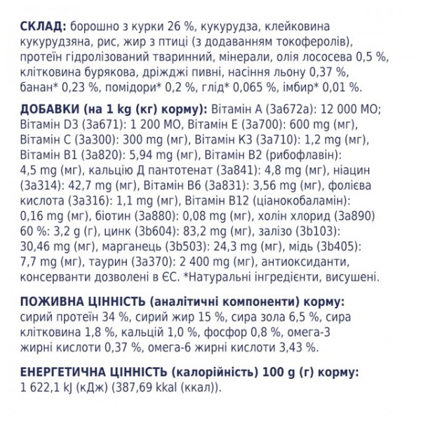 Гарантовані показники: сирий протеїн 34%, сирий жир 15%, сира зола 6.5%, сира клітковина 1.8%, кальцій 1%, фосфор 0.8%, омега 3 жирні кислоти 0.37%, омега-6 жирні кислоти 3.43%.