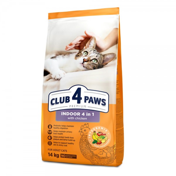 B4630201 " />Club 4 Paws Premium Adult Cats Indoor 4 in 1 являє собою повноцінний преміум-раціон. Харчування котів, які живуть у приміщенні та не гуляють на вулиці, має бути особливим і відрізнятися від раціону тварин, які проводять більшу частину часу поза домом. Сухий корм 4 Лапи для котів 4 в 1 був створений, враховуючи цей важливий момент.
