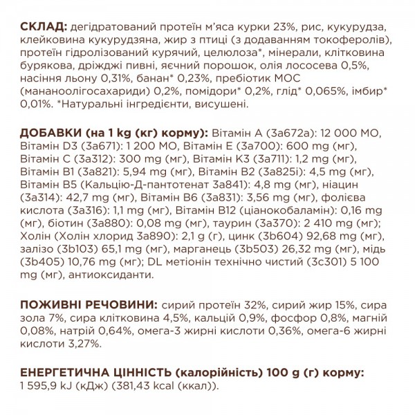 Склад: борошно з курки 23 %, рис, кукурудза, клейковина кукурудзяна, жир з птиці (з додаванням токоферолів), протеїн гідролізовани й тваринний, целюлоза*, мінерали, клітковина бурякова, дріжджі пивні, яєчний порошок, олія лососева 0,5 %, насіння льону 0,31 %, банан* 0,23 %, пребіотик МОС (мананоолігосахариди) 0,2 %, помідори* 0,2 %, глід* 0,065 %, імбир* 0,01 %.