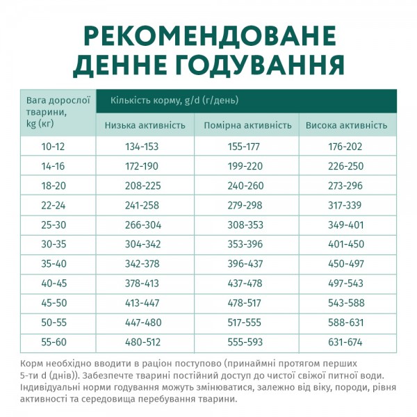 Добавки: Поживні добавки на 1 kg (кг) корму, mg/kg (мг/кг): вітамін А (3а672а): 15 000 МО, вітамін D3 (3а671): 800 МО, вітамін Е (3а700): 500, вітамін С (3а312): 200, вітамін B6 (3а831): 2,22, біотин (3а880): 0,14, таурин (3а370): 1 100; мікроелементи: цинк (3b603): 104,96, мідь (3b405): 11,24, марганець (3b502): 2,57, селен (3b801): 0,08. Технологічні добавки на 1 kg (кг) корму, mg/kg (мг/кг): антиоксидант природного походження: 330, екстракт токоферолу природного походження: 600.