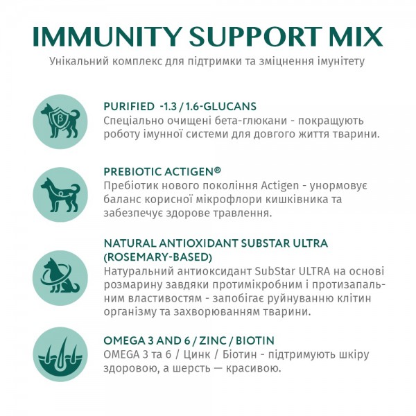Харчування містить унікальний комплекс Immunity Support Mix, який складається з: