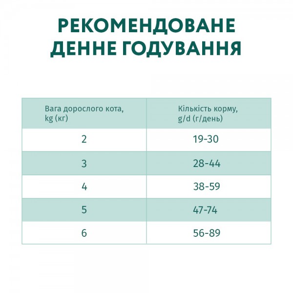 Інгредієнти: Дегідратований протеїн м’яса індички, не менше 25 %, кукурудзяний білок, рис, кукурудза, голозерний овес 5,46 %, жир курячий, безкісткове м’ясо індички 5 %, рослинна клітковина, протеїн гідролізований тваринний 3,5 %, м’якоть буряка, куряча печінка гідролізована суха, насіння льону 1,82 %, пивні дріжджі, яєчний порошок, мінерали, олія з лосося, журавлина 0,2 %, олія з огірочника, бета-1,3/1,6-глюкани 0,05 %, Actigen® (джерело пребіотик- мананоолігосахариди) 0,04 %, чорнобривці (джерело лютеїну) 0,04 %, корінь лопуха, корінь алтея, квіти ромашки 0,03 %, кропива 0,03 %, чебрець 0,015 %.