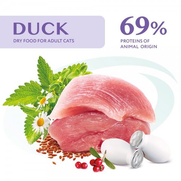 Інгредієнти:Дегідратований протеїн м’яса качки, не менше 26 %, рис, кукурудза, кукурудзяний білок, жир курячий, безкісткове м’ясо качки 5 %, целюлоза натурального походження, протеїн гідролізований тваринний 3,5 %, куряча печінка гідролізована суха, мінерали, насіння льону 1,74 %, м’якоть буряка, пивні дріжджі, олія з лосося 1 %, яєчний порошок, журавлина 0,2 %, олія з огірочника 0,1 %, бета-1,3/1,6-глюкани 0,05 %, Actigen® (джерело пребіотик- мананоолігосахариди) 0,04 %, чорнобривці (джерело лютеїну) 0,04 %, корінь лопуха, корінь алтея, квіти ромашки 0,03 %, кропива 0,03 %, чебрець 0,015 %.