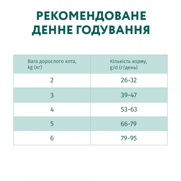 Добавки: Поживні добавки на 1 kg (кг) корму, mg/kg (мг/кг): вітамін А (3a672a): 15 000 МО, вітамін Д3 (3a671): 750 МО, вітамін Е (3a700): 600, вітамін С (3a300): 200, вітамін B6 (3a831): 6, біотин (3a880): 0,08, таурин (3a370): 2 100; мікроелементи: залізо (3b103): 35, йод (3b201): 2,5, мідь (3b405): 8,2, марганець (3b503): 38, цинк (3b604): 148, селен (E8): 0,09; амінокислота: DL-метіонін (3с301): 2 500.