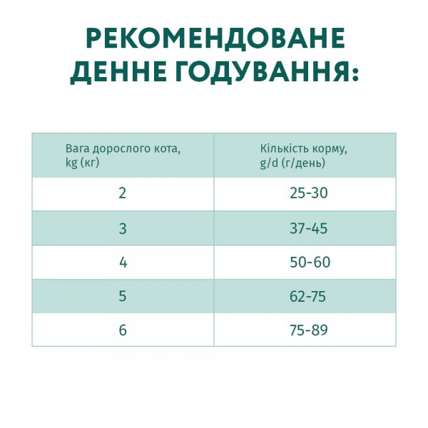 Добавки: Поживні добавки на 1 kg (кг) корму, mg/kg (мг/кг): вітамін А (3a672a): 15 000 МО, вітамін Д3 (3a671): 750 МО, вітамін Е (3a700): 600, вітамін С (3a300): 200; вітамін B6 (3a831): 6, біотин (3a880): 0,08, таурин (3a370): 2 100; мікроелементи: залізо (3b104): 35, йод (3b201): 2,5, мідь (3b405): 8,2, марганець (3b503): 38, цинк (3b604): 148, селен (E8): 0,09; амінокислота: DL-метіонін (3с301): 2 500.