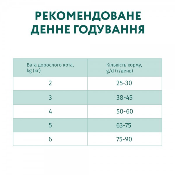 Добавки: Поживні добавки на 1 kg (кг) корму, mg/kg ( мг/кг): вітамін А (3а672а): 15 000 МО, вітамін Д3 (3а671): 750 МО, вітамін Е (3а700): 600, вітамін С (3а300): 200; вітамін B6 (3а831): 6, біотин (3а880): 0,08, таурин (3а370): 2 100; мікроелементи: залізо (3b103): 35, йод (3b201): 2,5, мідь (3b405): 8,2, марганець (3b503): 38, цинк (3b604): 148, селен (E8): 0,09; амінокислота: DL-метіонін (3c301): 900.