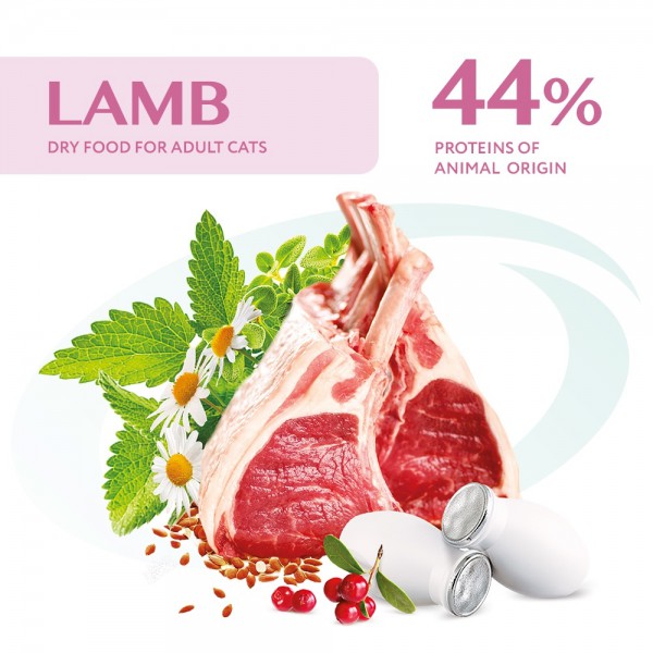 Інгредієнти: Дегідратований протеїн м’яса ягняти, не менше 14 %, рис коричневий, рис, кукурудзяний білок, безкісткове м’ясо ягняти 12 %, ячмінь, картопляний протеїн, жир курячий, дегідратований протеїн м’яса курки 7 %, протеїн гідролізований тваринний 3,5 %, мінерали, насіння льону 1,75 %, пивні дріжджі, м’якоть буряка, олія з лосося, яєчний порошок, корінь цикорію 0,26 %, подорожник, журавлина 0,2 %, олія з огірочника, бета-1,3/1,6-глюкани 0,05 %, Actigen® (джерело пребіотик- мананоолігосахариди) 0,04 %, чорнобривці (джерело лютеїну) 0,04 %, корінь лопуха, корінь алтея, квіти ромашки 0,03 %, кропива 0,03 %, чебрець 0,015 %.