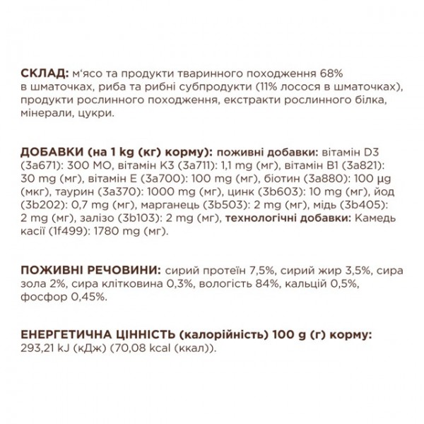 Склад: 68 % м‘яса та продуктів тваринного походження в шматочках, риба та рибні субпродукти (9 % лосося в шматочках), злаки, екстракти рослинного білка, мінерали, фрукти (банан 0,1 %, глід 0,03 %)*, овочі (помідори 0,11 %)*, олії та жири (олія з лосося 0,09 %), імбир* 0,005 %.
