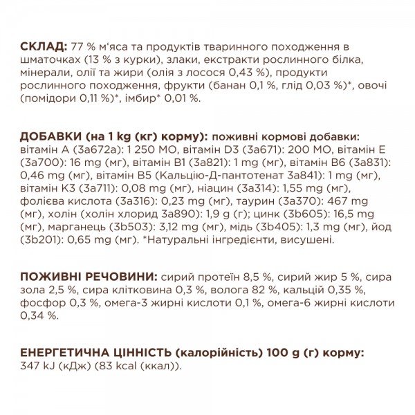 Склад: 77 % м‘яса та продуктів тваринного походження в шматочках (13 % з курки), злаки, екстракти рослинного білка, мінерали, олії та жири (олія з лосося 0,43 %), продукти рослинного походження, фрукти (банан 0,1 %, глід 0,03 %)*, овочі (помідори 0,11 %)*, імбир* 0,01 %.
