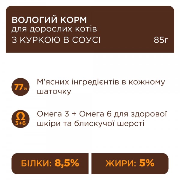 - Котячий вологий корм Клуб 4 Лапи з куркою в соусі заснований на формулі 8,5/5, яка забезпечує оптимальне співвідношення поживних речовин;