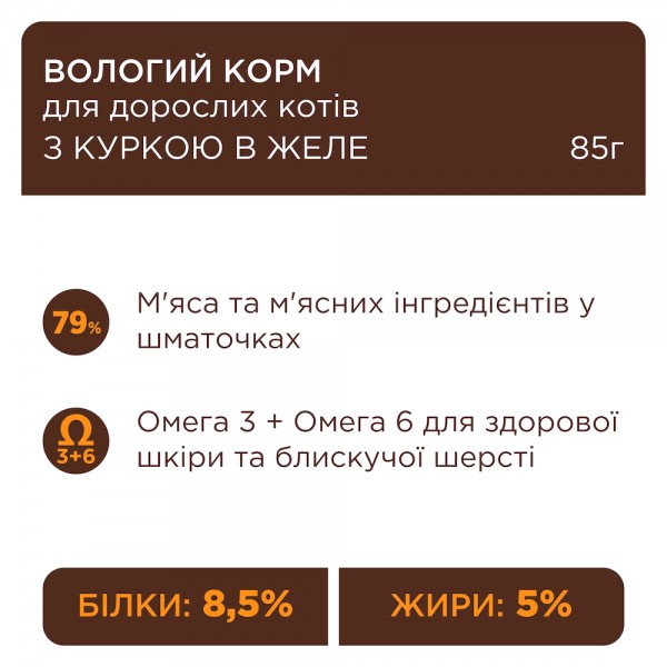 Вологий преміум-раціон містить 79% м'яса та м'ясних інгредієнтів у шматочках та апетитне желе, що чудово смакують дорослим котам. Комплекс ненасичених жирних кислот Омега 3 + Омега 6 підтримує шкіру здоровою, а шерсть блискучою. Раціон збагачений формулою ІNTEGRAMIX для загальної підтримки здоров’я та імунітету улюбленця.