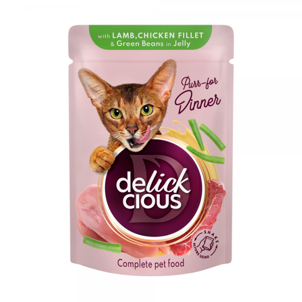 B5410301 " />Delickcious with Lamb, Chicken Fillet & Green Beans in Jelly «Шматочки з ягнятиною, курячим філе і квасолею спаржевою в желе». Повнораціонний консервований корм для дорослих котів.