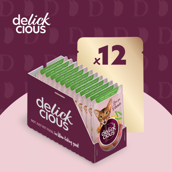 Вологий корм Delickcious шматочки з ягнятиною, курячим філе і квасолею спаржевою в желе для котів 12шт x 85г