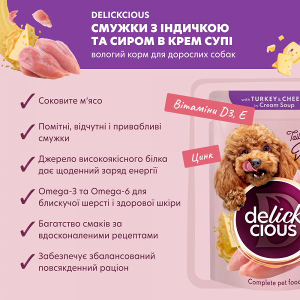 Смужки з ніжною індичкою і ароматним сиром у вишуканому крем-супі. Цей повнораціонний корм відмінно підходить як щоденне харчування навіть для примхливих гурманів. Смачні смужки подарують вашому улюбленцеві новий рівень задоволення від їжі. А незабутній смак відчуватиметься у кожному лизь. Час потішити собаку справжньою ням-ням-нямсолодою. Делизькатес Delickcious. Не просто їжа, а вау-лизь!
