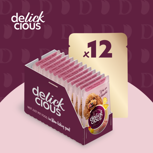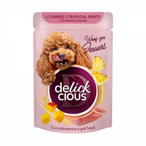 D6211501 " />Delickcious with Turkey & Tropical Fruits in Creamy Sauce «Пластівці з індичкою та тропічними фруктами у вершковому соусі» Додатковий консервований корм для дорослих собак.