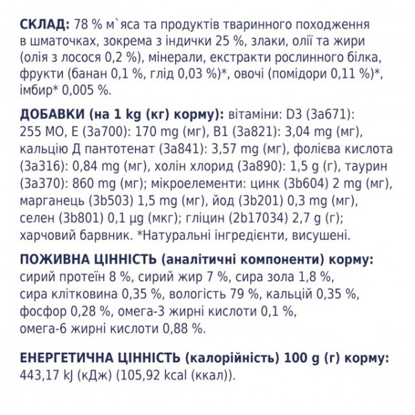 Склад: 78 % м`яса та продуктів тваринного походження в шматочках, зокрема з індички 25 %, злаки, олії та жири (олія з лосося 0,2 %), мінерали, екстракти рослинного білка, фрукти (банан 0,1 %, глід 0,03 %)*, овочі (помідори 0,11 %)*, імбир* 0,005 %.