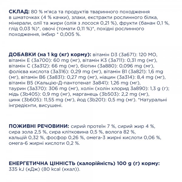 Склад: 80 % м‘яса та продуктів тваринного походження в шматочках (4 % качки), злаки, екстракти рослинного білка, мінерали, олії та жири (олія з лосося 0,21 %), фрукти (банан 0,1 %, глід 0,03 %)*, овочі (томати 0,11 %)*, похідні рослинного походження, імбир * 0,005 % .