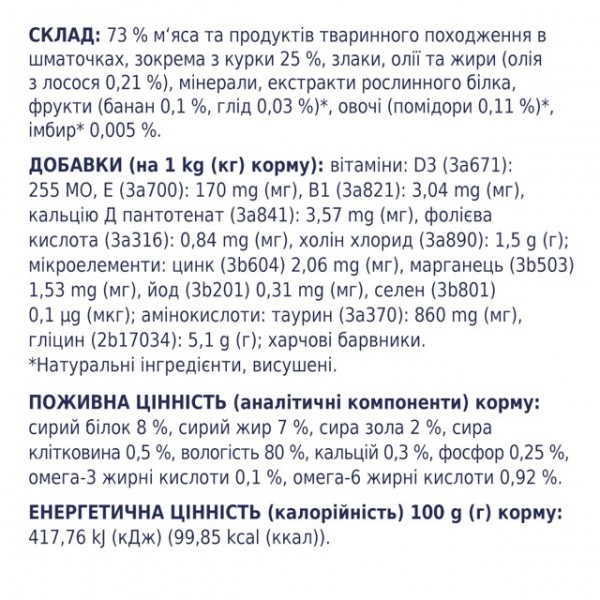 Склад: 73 % м‘яса та продуктів тваринного походження в шматочках, зокрема з курки 25 %, злаки, олії та жири (олія з лосося 0,21 %), мінерали, екстракти рослинного білка, фрукти (банан 0,1 %, глід 0,03 %)*, овочі (помідори 0,11 %)*, імбир* 0,005 %.