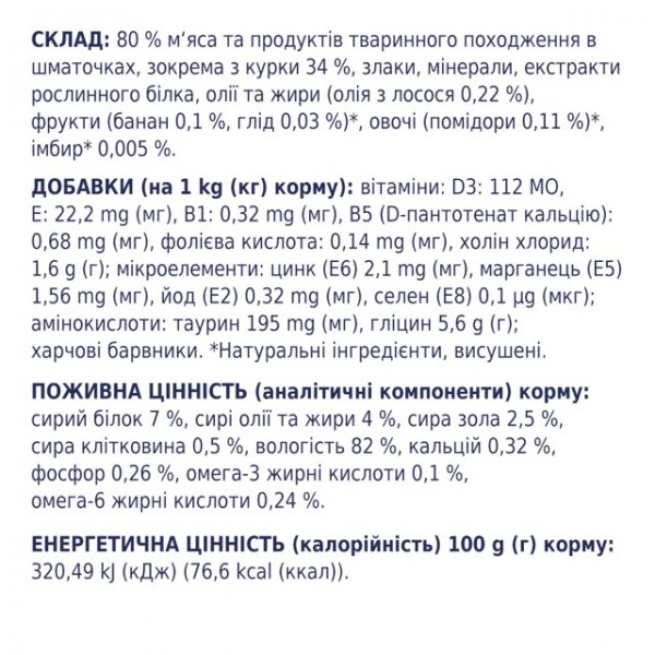 Склад: 80 % м‘яса та продуктів тваринного походження в шматочках, зокрема з курки 34 %, злаки, мінерали, екстракти рослинного білка, олії та жири (олія з лосося 0,22 %), фрукти (банан 0,1 %, глід 0,03 %)*, овочі (помідори 0,11 %)*, імбир* 0,005 %.