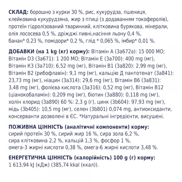 Склад: борошно з курки 30 %, рис, кукурудза, пшениця, клейковина кукурудзяна, жир з птиці (з додаванням токоферолів), протеїн гідролізований тваринний, клітковина бурякова, мінерали, олія лососева 0,5 %, дріжджі пивні,насіння льону 0,4 %, банан* 0,23 %, помідори* 0,2 %, глід * 0,065 %, імбир* 0,01 %.