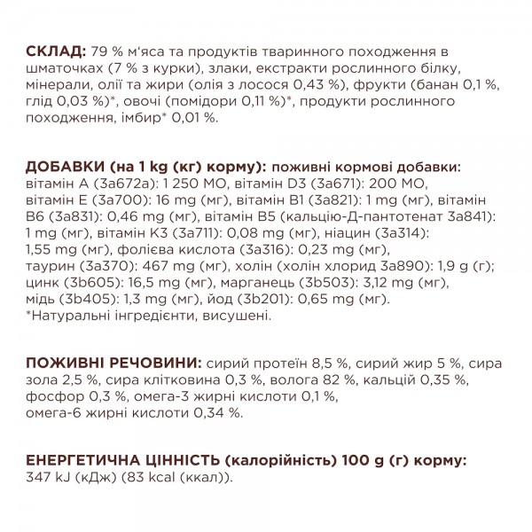 Склад: 79 % м‘яса та продуктів тваринного походження в шматочках (7 % з курки), злаки, екстракти рослинного білку, мінерали, олії та жири (олія з лосося 0,43 %), фрукти (банан 0,1 %, глід 0,03 %)*, овочі (помідори 0,11 %)*, продукти рослинного походження, імбир* 0,01 %.